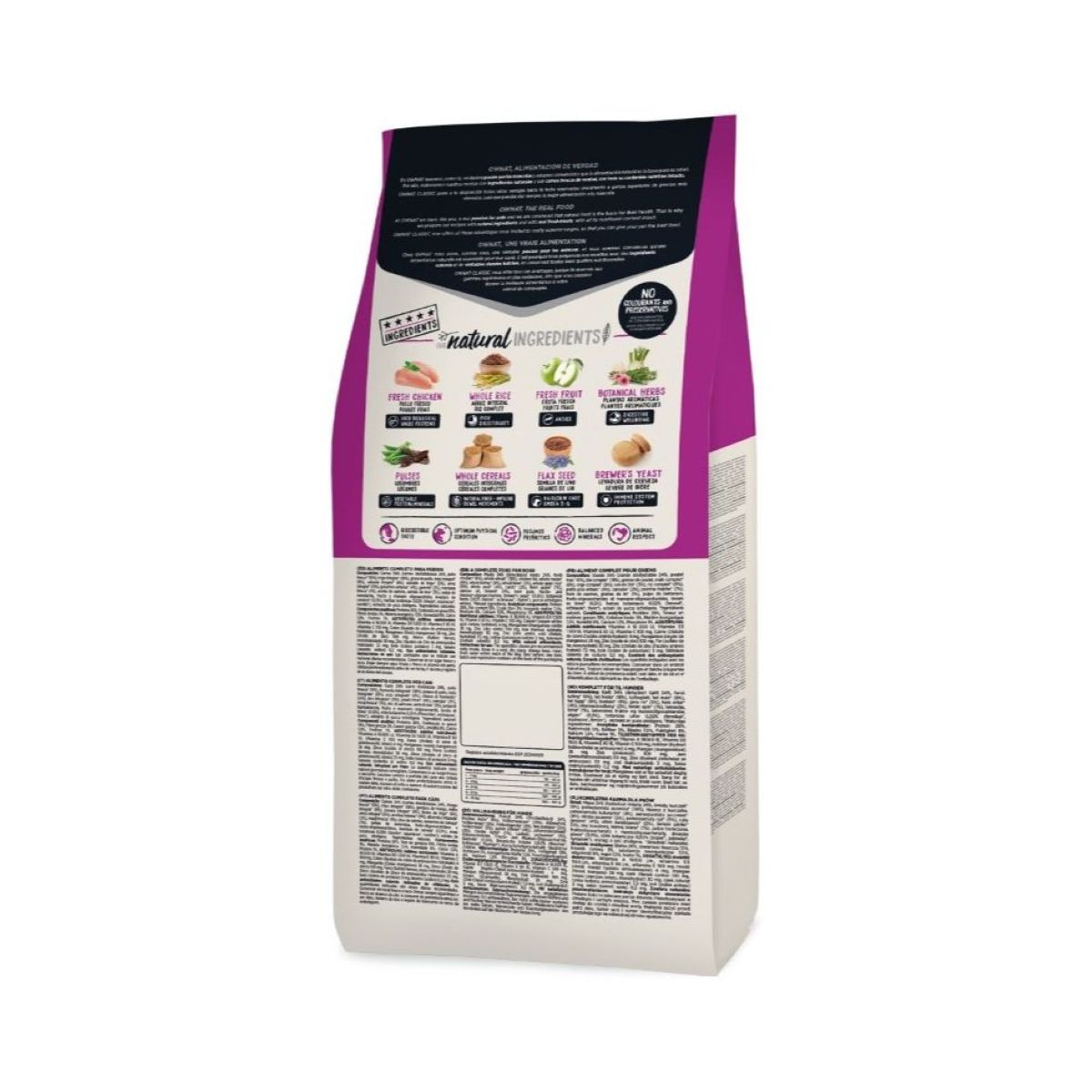 Carnes 34% (carnes deshidratadas 24%, pollo fresco* 10% antes de la extrusión), trigo integral* (18%), grasa de pollo, maíz integral* (8%), cebada integral* (8%), salvado de trigo* (5%), arroz integral* (5%), guisantes enteros* (4%), garrofa* (2%), manzana* (1%), aceite de salmón, semilla de lino* (1%), pulpa de remolacha, fructo y manano oligosacáridos, levadura de cerveza* (0,5%), plantas aromáticas (0,02%) (hinojo*, equinácea*, tomillo*), yucca schidigera. *INGREDIENTES NATURALES
