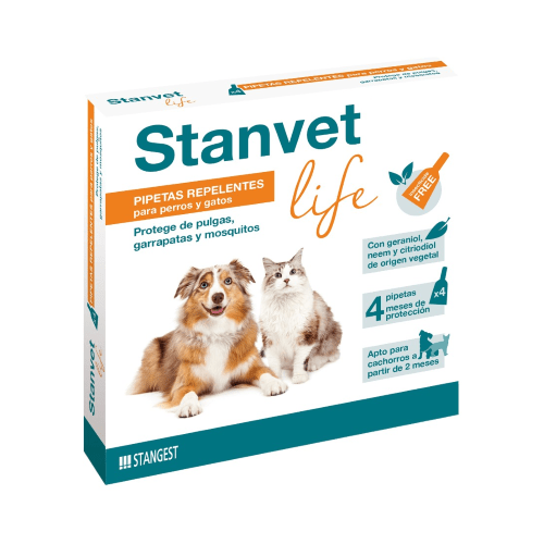 Las pipetas repelentes Stanvet Life protegen a perros y gatos frente a pulgas, garrapatas y mosquitos durante 1 mes.
